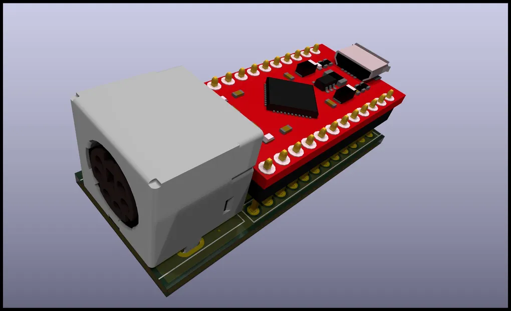 - Inspect — continuity-check GND and +5V to the PS/2 socket before first insert of the Pro Micro, and verify no shorts between adjacent DIN pins.