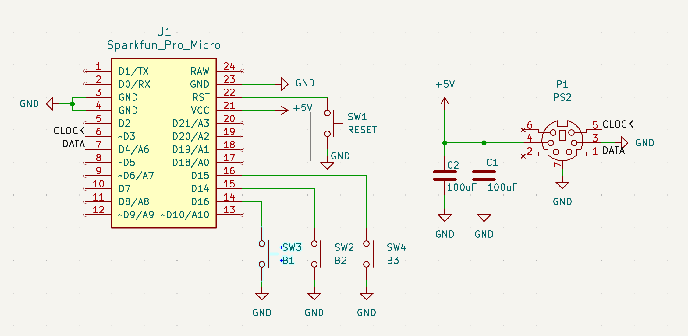 The KiCad project also includes power nets, shield, and Pro Micro pinout as in the schematic. If you substitute another ATmega32U4 board, re-map D3/D4/D2 in firmware to match your wiring.
